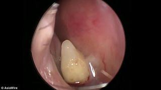 Medicii au gasit un corp strain in nasul femeii si, initial, au crezut ca este vorba despre o pietricica, dar la o cercetare amanuntita au aflat ceva ce i-a facut sa se inchine. In nasul femeii crescuse un dinte, iar acesta ii provoca dureri si sangerari. "Vedeam ca are nasul obturat de ceva cu o densitate mare si am banuit ca ar fi vorba despre o piatra sau un obiect care sa ii obtureze caile respiratorii.