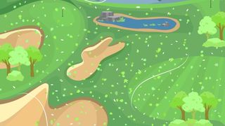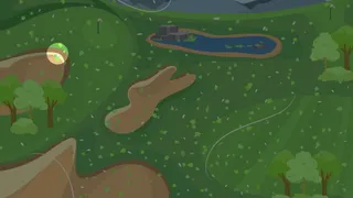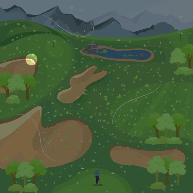 Imaginea de mai sus arată un jucător de golf cu picioarele încrucișate, în timp ce se sprijină pe o crosă. Se uită drept înainte pe un câmp plin de capcane de nisip, copaci, gazon și un lac.