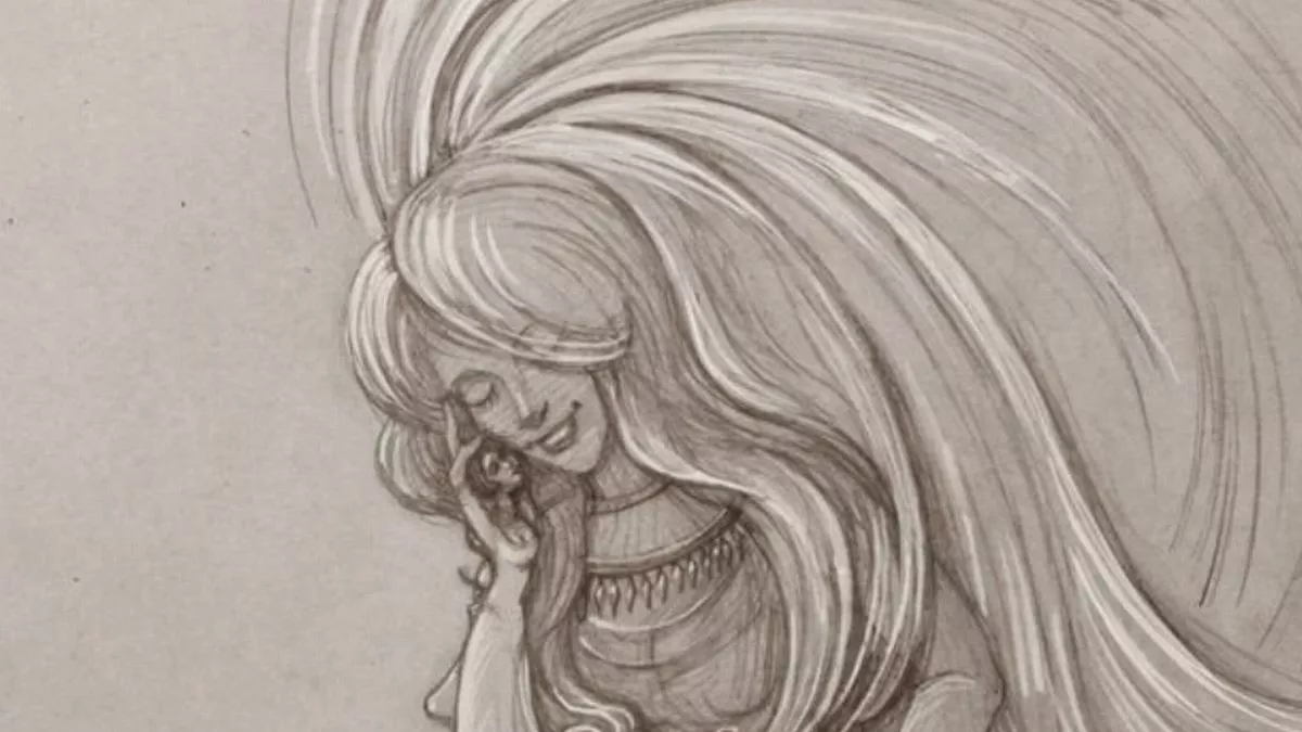La prima vedere, imaginea arată o schiță a unei singure femei cu părul des și o rochie destul de fluidă- care zâmbește în timp ce vorbește la telefon.