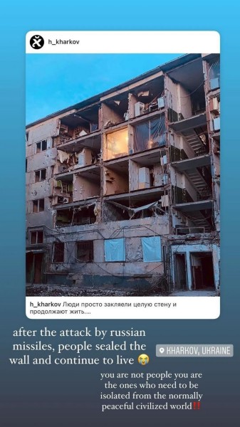 Marina Bekh-Romanchuk a publicat pe contul său de Instagram o imagine tulburătoare cu un astfel de bloc de locuinţe, care a fost grav avariat de bombardamente.