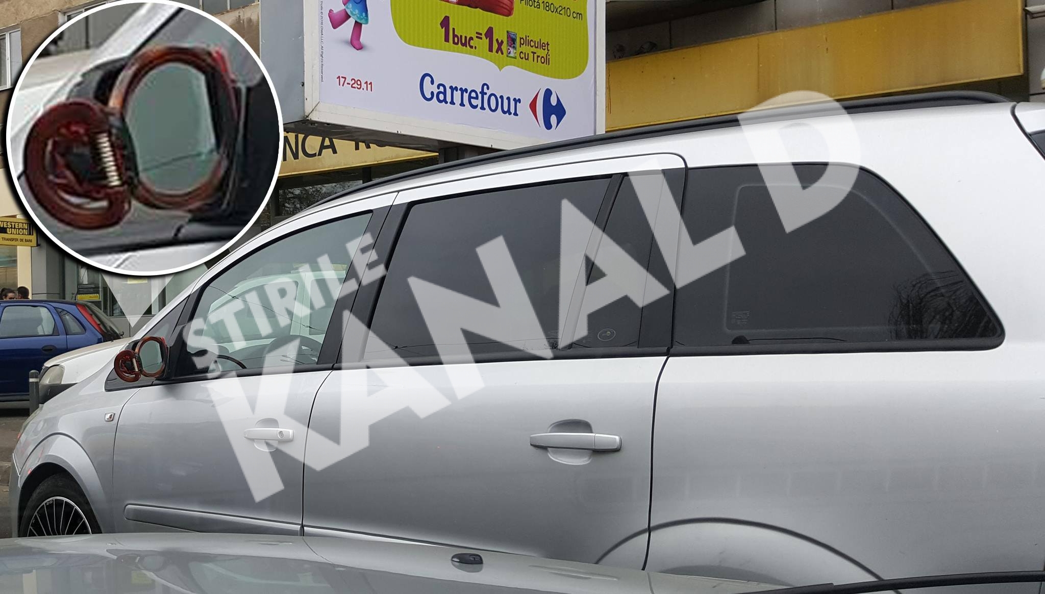 Conducatorul auto a ramas fara oglinda de pe partea stanga, dar a rezolvat situatia inedit. El a improvizat cu o oglinda de voiaj pe care a atasat-o masinii si a iesit asa la drum.