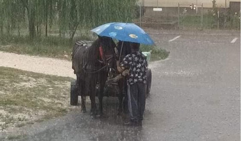 Bărbatul din Pitești a fost prins de ploaie chiar pe străzile oraşului şi a hotărât să-şi protejeze cei doi cai înhămaţi la caruţă cu umbrela pe care o avea.