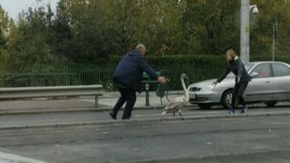 Un barbat si o femeie au reusit pana la urma sa ghideze pasarea intr-o zona mai sigur, spre parc, locatie de unde aceasta a putut sa ajunga extrem de aproape de lacul din parc care ii serveste drept casa.