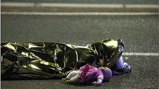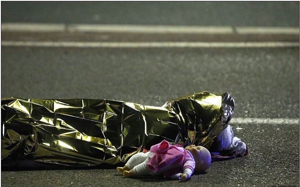 Povestea trista a fotografiei: O copila care a fost ucisa in atacul din Nisa, zace pe sosea, acoperita cu o folie din aluminiu. Langa fetita, este asezata papusa pe care o tinea in brate inainte sa moara.