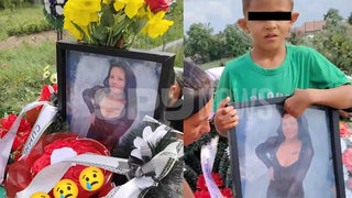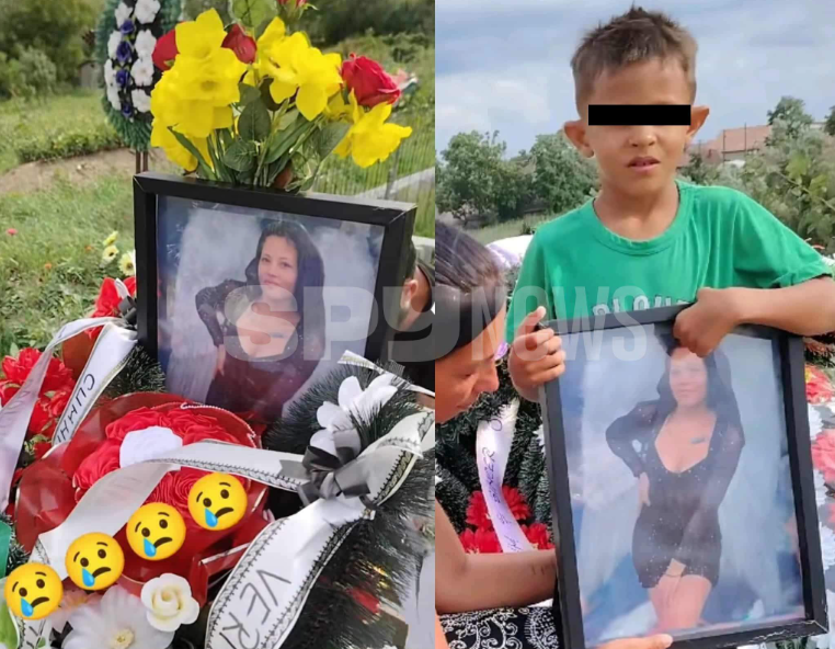 Cu ochii în lacrimi și cu dor în suflet, băiatul s-a pozat cu fotografia mamei sale lângă crucea mormântului acoperit cu coroane de flori, potrivit spynews.ro.