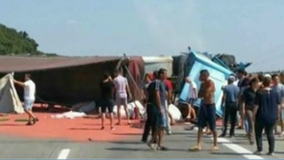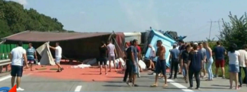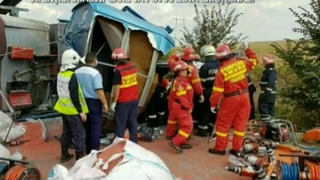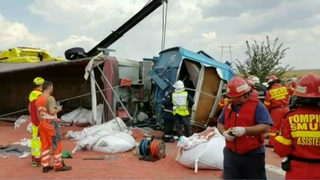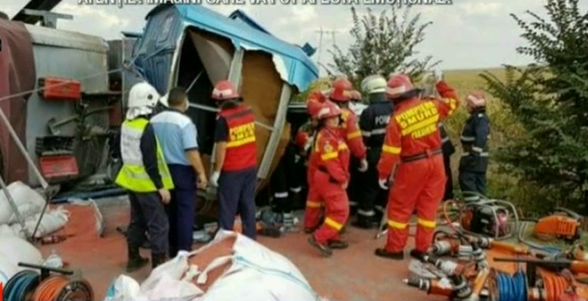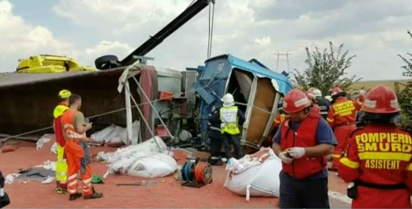 Avem imagini de coşmar cu momentul în care un tir încărcat cu cereale trece peste parapeţi şi se răstoarnă peste o maşină în mers pe Autostrada Soarelui. Camera de bord din maşina strivită surprinde impactul devastator.