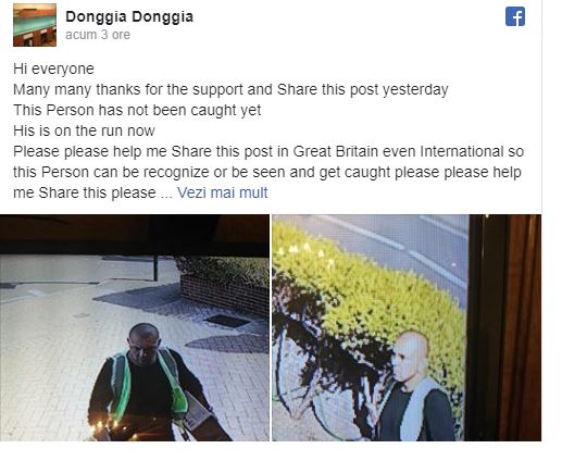 „Această persoană nu a fost prinsă şi este în continuare căutată. Ar putea fi bulgar sau român. Vă rugăm să distribuiţi această postare în Marea Britanie, dar şi în comunităţile de români şi bulgari. Fiica mea şi-a putea pierde vederea la un ochi, iar mama are nevoie de o operaţie la cap.