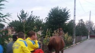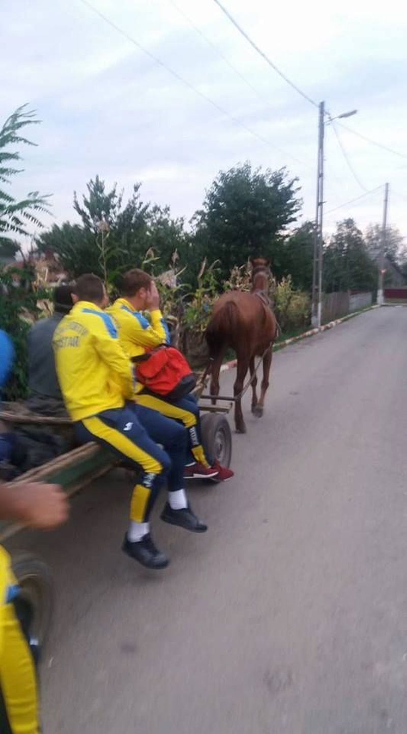 Cativa jucatori de fotbal au ales sa mearga pana la autocar cu caruta. Cand si-au dat seama ca sunt fotografiati, si-au acoperit fetele.