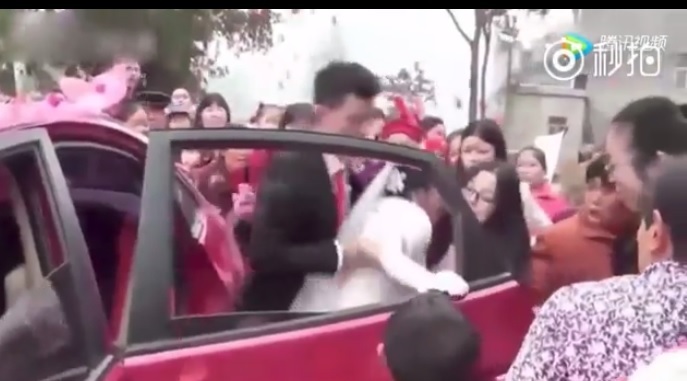 Imagini violente cu un mire care isi taraste sotia afara din masina, in mijlocul nuntii, au facut valuri pe internet.