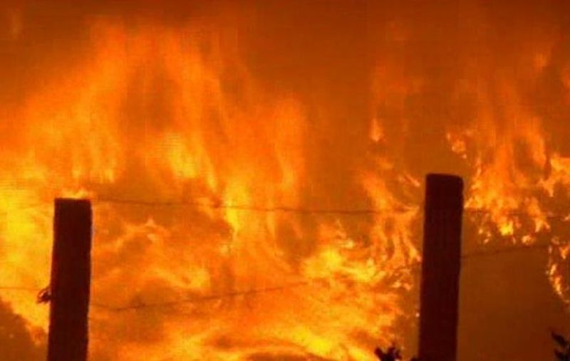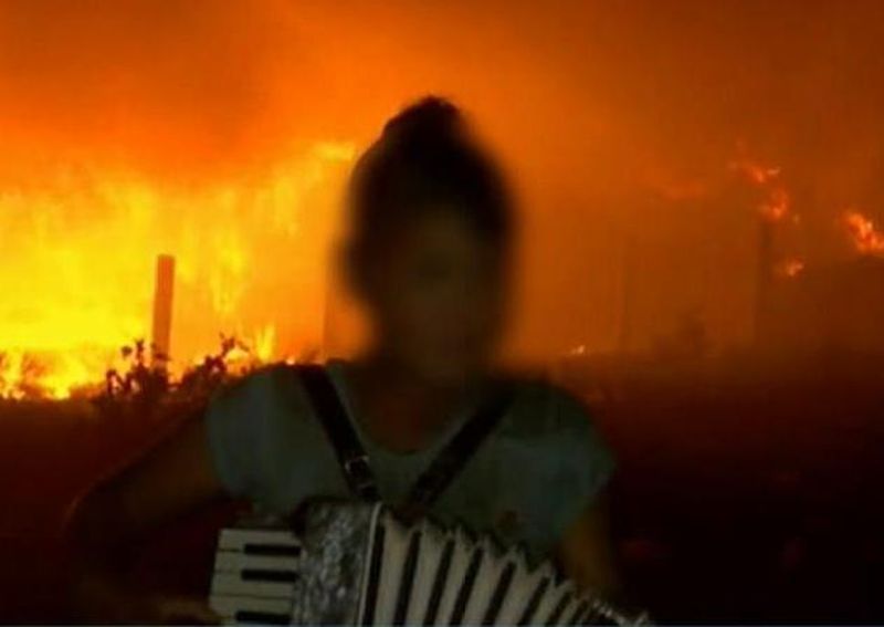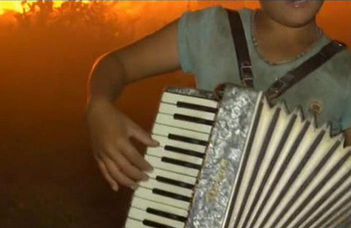 Imagini halucinante. Un baiat canta la acordeon si da dedicatii, iar in spatele lui flacarile erau cat un bloc cu 8 etaje
