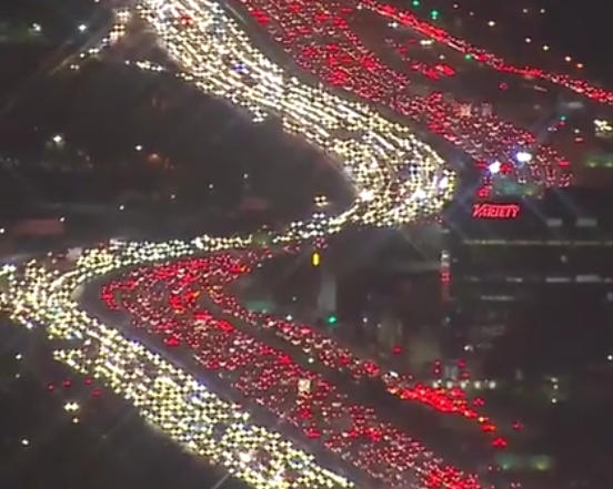 Imaginile surprinse din elicopter arata mii de masini pe o autostrada din Los Angeles. Americanii circula bara la bara.