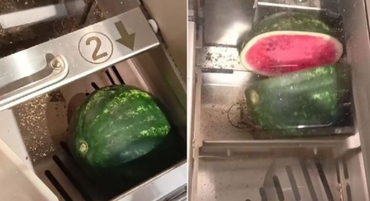 Mai exact, tatăl i-a arătat fiului cea mai simplă metodă de a felia pepenele, fără prea multe bătăi de cap, chiar înainte de a ajunge la casa de marcat. La indicațiile tatălui, copilul a pus pepenele în aparatul de feliat pâine și, în doar câteva secunde, problema a fost rezolvată.