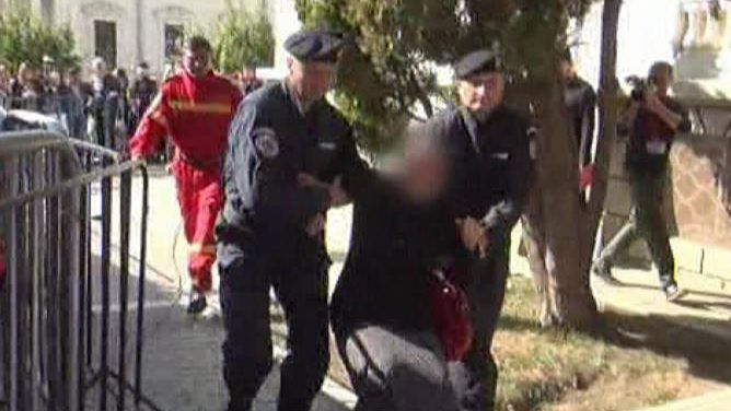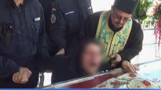 Jandarmii o cara din multime, spre racla cu moaste. Spectacolul grotesc la care asistam ii impietreste pe credinciosi. Exemplul, barbatul din imagine.