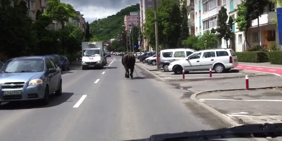 Imaginile au fost postate pe Facebook si au facut senzatiel. Desi putea provoca dezastru, bivolul s-a aratat a fi foarte disciplinat in trafic.