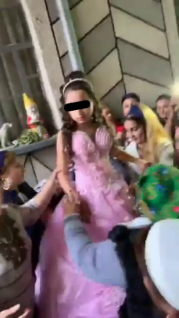 Astfel, filmările postate chiar pe contul de scializare al manelistului arată doi copii, care mai au ani buni până vor intra, în mod legal, în rândul celor care au buletin, înconjuraţi de familiile lor, în mijlocul unei petreceri. Nu, nu era vreo zi de naştere, ci, din păcate, era… nunta lor. Ginerică, cu o privire de copil care ar prefera să se joace cu nişte avioane, in varsta de doar 10 anisori, iar mireasa, machiată strident, într-o rochie potrivită petru când ar împlini vreo 16 ani, adică dublul vârstei pe care o are, cu nişte cupe pe care nu are cum să le umple, înconjurată de o rudele ei, au fost prezentaţi de cântăreţ ca fiind vedetele cununiei.