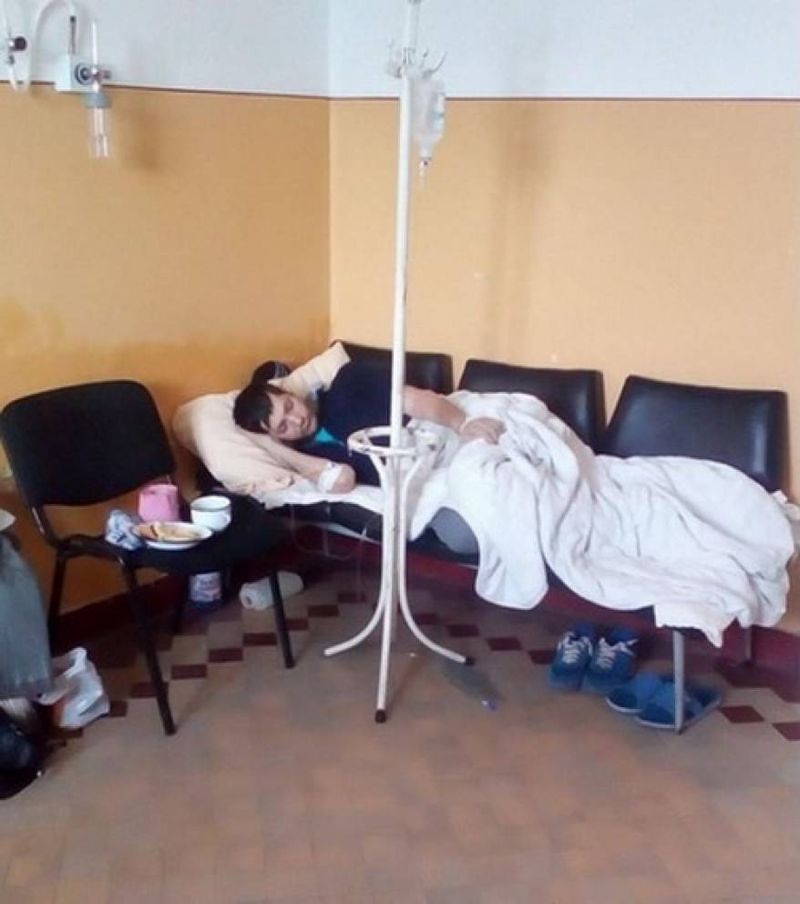 Un alt tanar a surprins momentul si a postat fotografia pe o retea de socializare. "Conditii spitalul Medias", a scris acesta alaturi de fotografie.