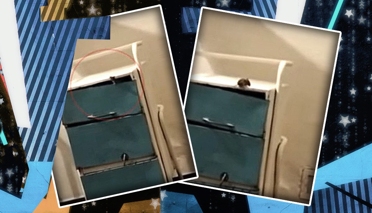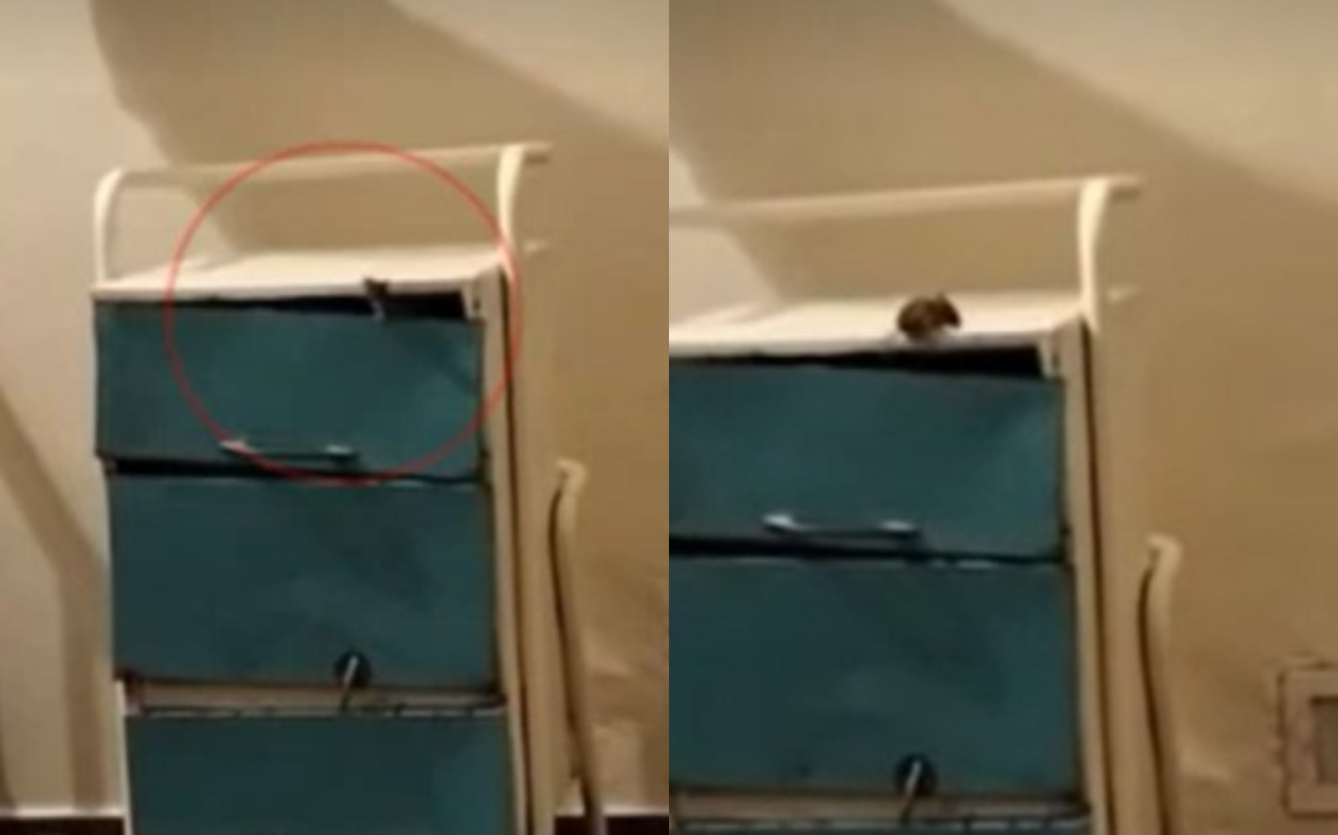 În imagini se vede cum șoarecele iese din sertarul unei noptiere și se urcă pe mobilier, apoi se sperie și se întoare de unde a venit.