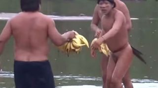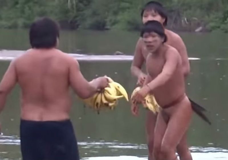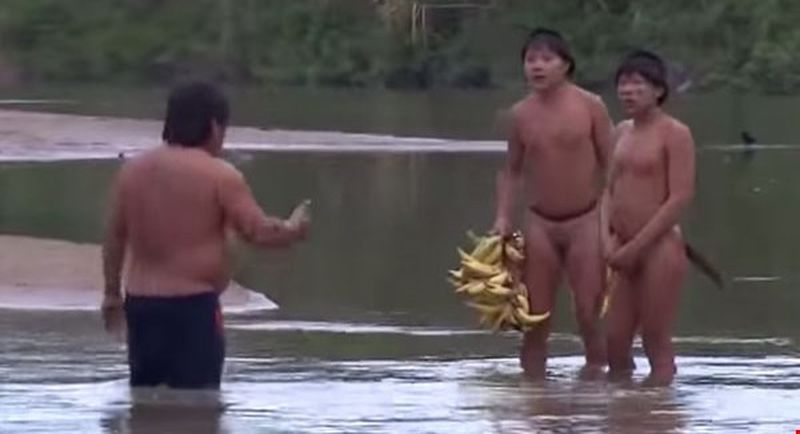 Doi dintre membrii tribului au traversat râul şi au acceptat câteva banane oferite de delegaţia trimisă de Departamentul pentru Afaceri indiene din Brazilia (Funai).