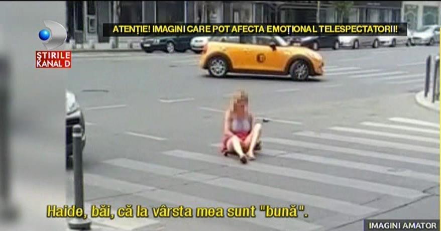 Cateva ore mai tarziu, bulevardul Magheru, kilometrul 0 al capitalei. Pe o trecere de pietoni aceasta doamna pare sa continue spectacolul inceput de tanara de dimineata. Doar ca imaginile sunt mai grotesti: isi pune, la propriu poalele-n cap.