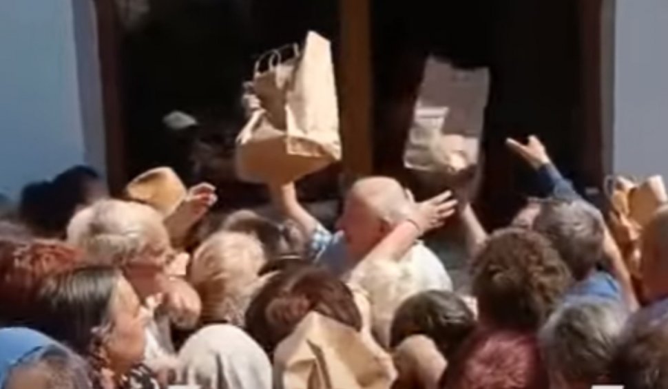 Chiar sub razele puternice ale soarelui, oamenii se împing, se îmbrâncesc și mai aveau foarte puțin până să se calce în picioare. Un întreg haos pentru un pachet care conținea de fapt o pâine mică, colivă, o caserolă cu cartofi prăjiți şi un cârnat.