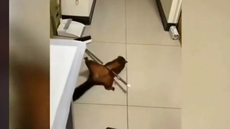 Rozătoarea aleargă până la o mătură și un făraș, înainte de a lăsa instrumentele de curățenie să cadă, în timp ce se întinde pe podea.