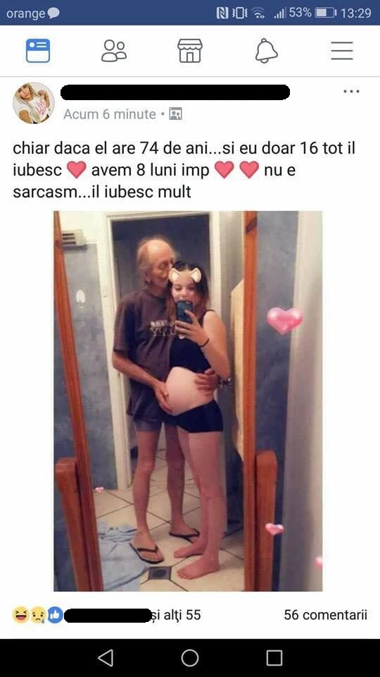 Multi utilizatori s-au declarat scarbiti de relatia pe care o are un batran de 74 de ani cu o minora de 16 ani. Desi ii poate fi bunic lejer, barbatul va deveni tata in curand, intrucat tanara ii poarta in pantece copilul.