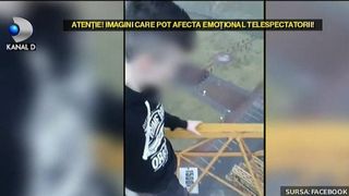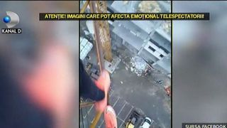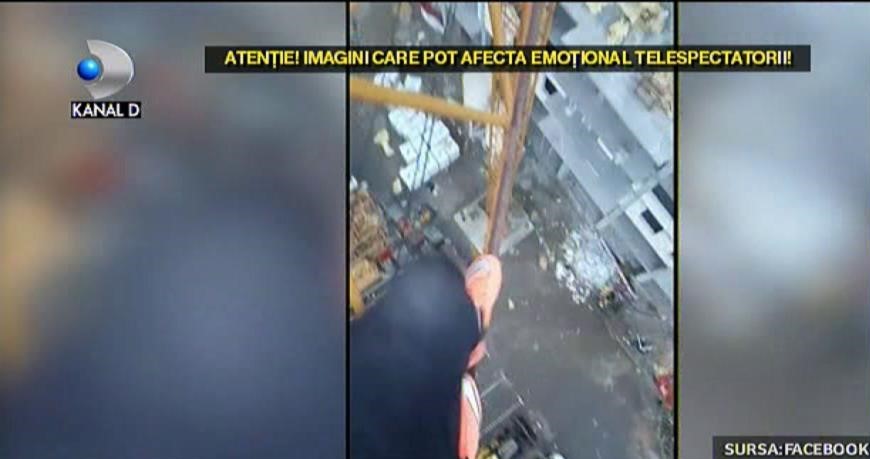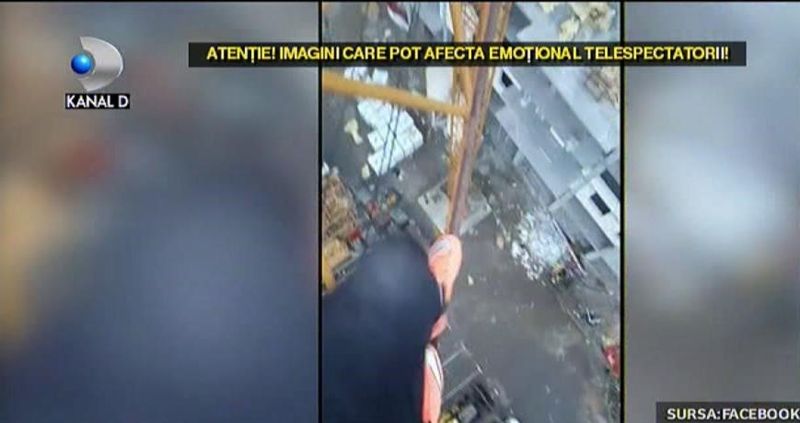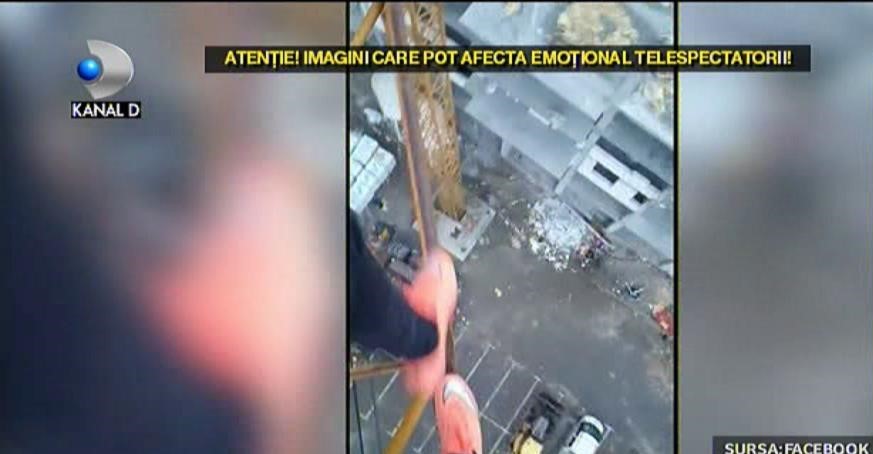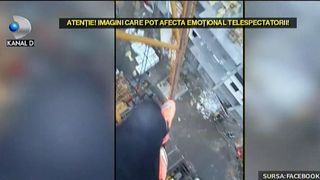 Cu o mana se tine de fiare, iar cu cealalta tine camera video ca sa-si filmeze bravura. Un minut si 13 secunde dureaza grozavia. Desi e pe un santier in lucru, nimeni nu pare sa-i fi observat prezenta.