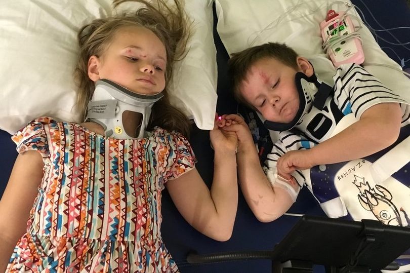 Angie si Zachary, in varsta de 8 si 5 ani, se tin de mana in spital la cateva saptamani de cand parintii lor au murit intr-un accident groaznic de masina.