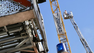 Pe schelă au urcat un pompier și un operator de poliție, sprijiniți de un braț mecanic, încercând să-l convingă pe tânărul român să coboare și să-și îmbrățișeze patrupedele.