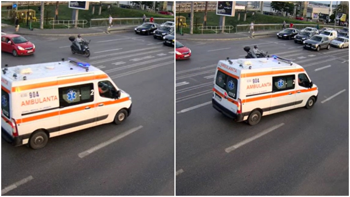 Un teribil accident s-a petrecut într-o intersecție semaforizată, la Iași. Camerele de supraveghere au surprins momentul impactului dintre o ambulanță aflată în misiune și o motocicletă.