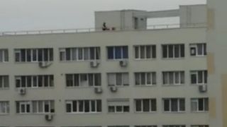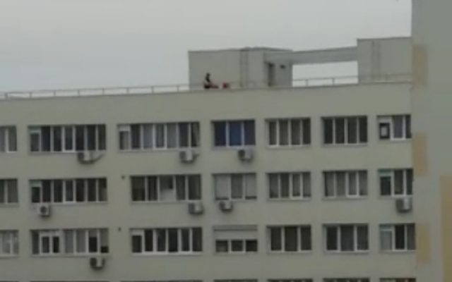 Bărbatul a fost filmat de la un bloc aflat vizavi de cel pe acoperișul căruia își face plimbarea.