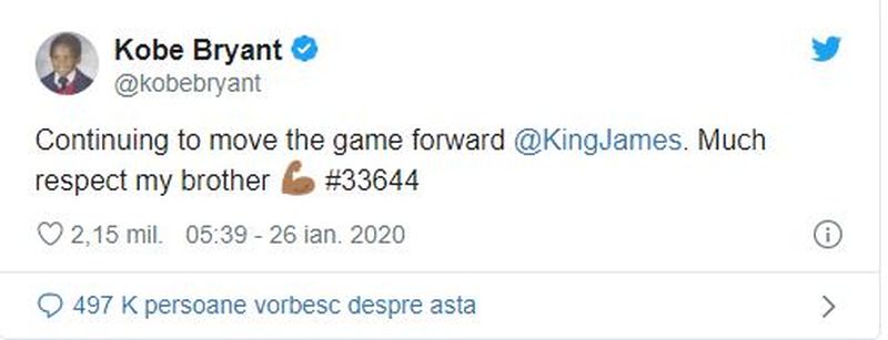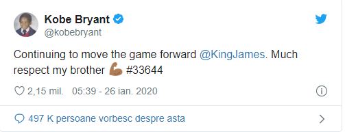 Cu doar câteva ore înainte ca baschetbalistul Kobe Bryant să-și piardă viața în accidentul de elicopter, sportivul a postat pe contul personal de Twitter un mesaj dedicat lui LeBron James, un alt baschetbalist celebru. Kobe îl felicită pe LeBron pentru performanțele reușite din ultima perioadă, și anume recordul de puncte înscrise în NBA.