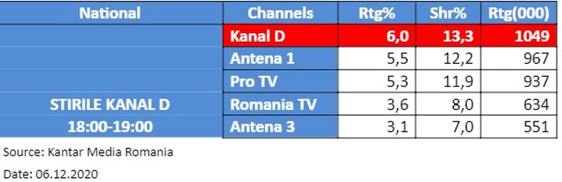 Duminică, 6 decembrie, Kanal D a fost prima sursă de informație pentru românii din întreagă țară, stația poziționându-se pe primul loc, la nivel Național, în topul televiziunilor din România, cu Știrile Kanal D de la ora 18:00.