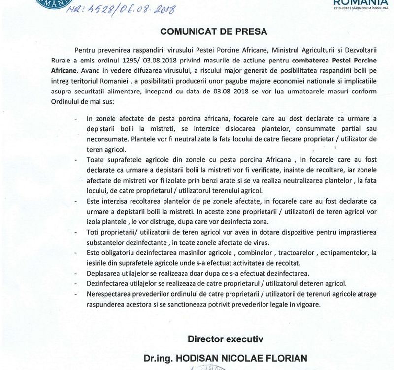 Printre masurile de urgenta, oficialii din minister au hotarat sa fie ucisi toti mistretii din zonele afectate.