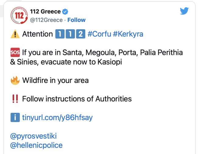 Prin numărul de urgență 112, s-a transmis un mesaj pentru evacuarea zonelor Santa, Megoula, Porta, Palia Perithia și Sinies.