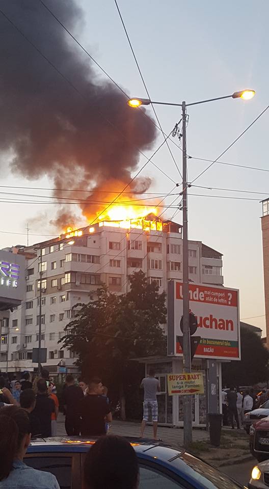 2 din 5 | Incendiu de proportii la mansarda unui bloc din Bacau. A fost nevoie de zece autospeciale ISU pentru a stinge flacarile