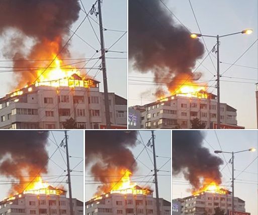 5 din 5 | Incendiu de proportii la mansarda unui bloc din Bacau. A fost nevoie de zece autospeciale ISU pentru a stinge flacarile