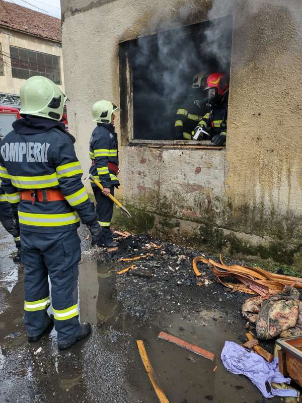 Echipajele de pompieri au localizat incendiul şi au acţionat pentru evacuarea materialelor arse din interior, între acestea aflându-se şi o butelie de gaz.