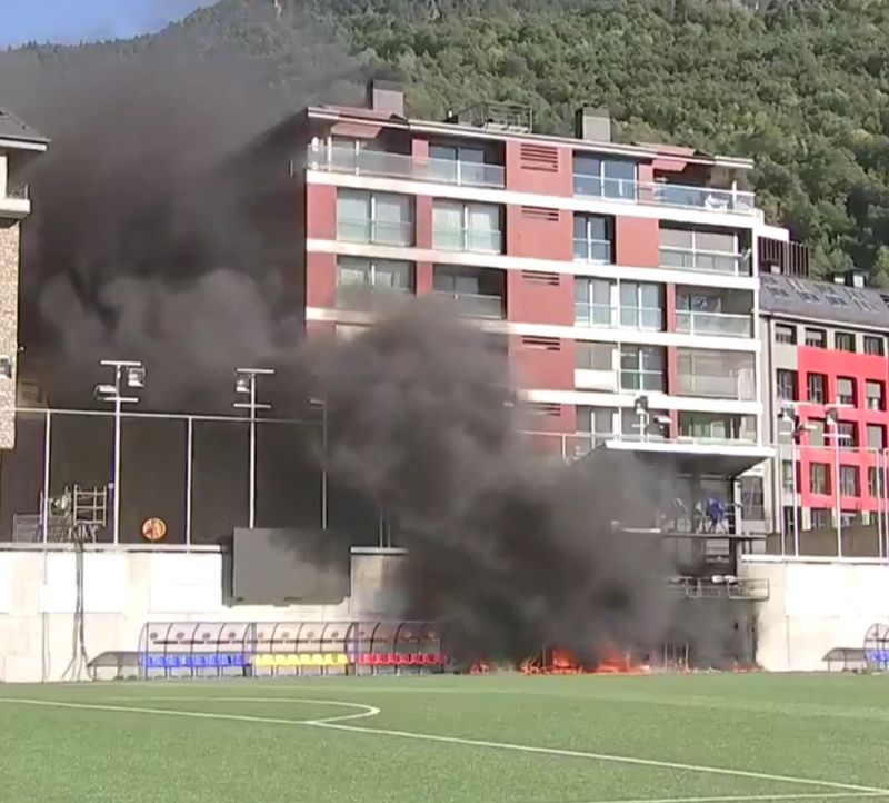 Potrivit The Guardian, flăcările au cuprins zona rezervată mass-media la trei ore după ce naţionala Angliei a efectuat un antrenament la arena din Andorra.