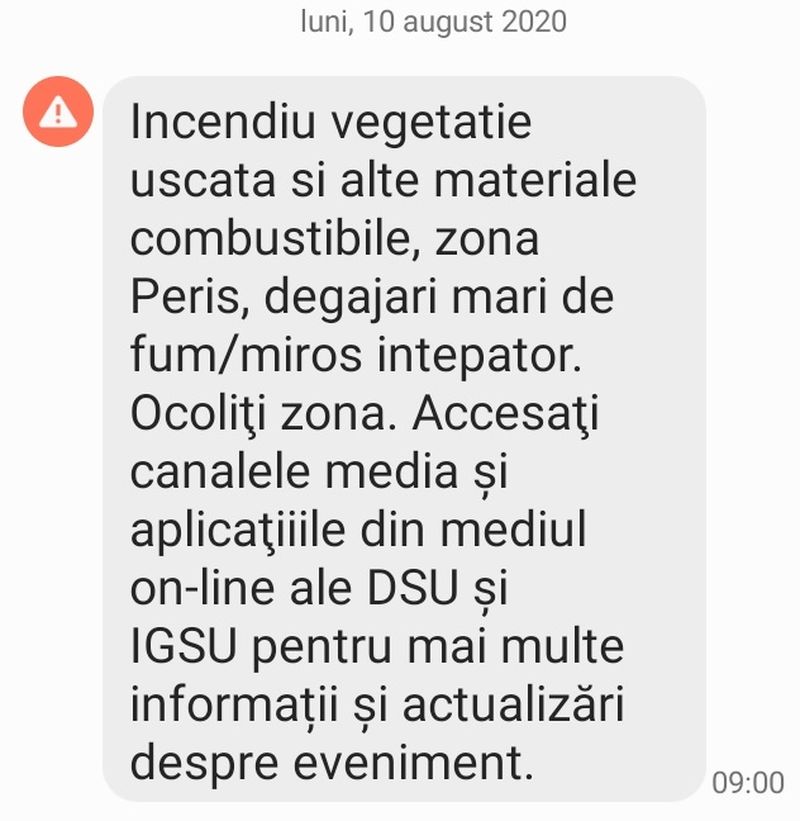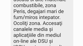 Mesajul primit luni dimineață de locuitorii din apropierea Bucureștiului prin sistemul Ro-Alert: "Incendiu vegetație uscată și alte materiale combustibile, zona Periș, degajări mari fum/miros înțepător. Ocoliția zona. Accesați canalele media și aplicațiile din mediul on-line ale DSU și IGSU pentru mai multe informații și actualizări despre eveniment"