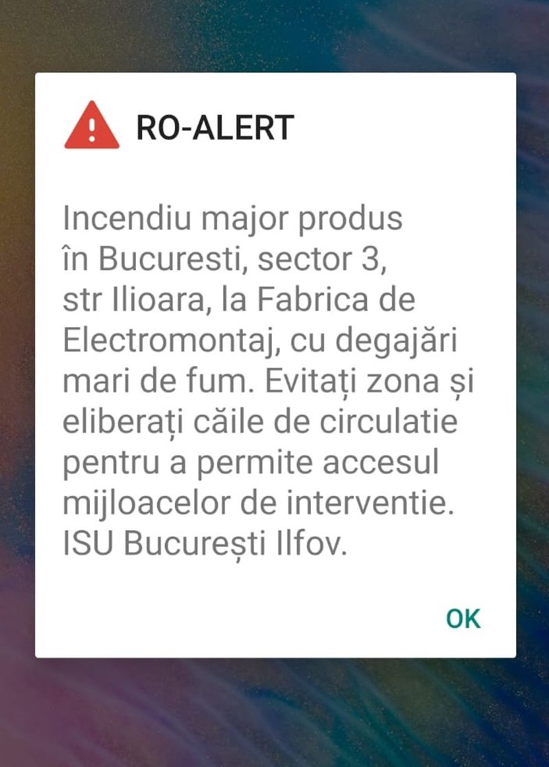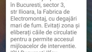 ”Incendiu major produs în București, sector 3, str Ilioara, la Fabrica de Electromontaj, cu degajări mari de fum”, se arată în mesaj.