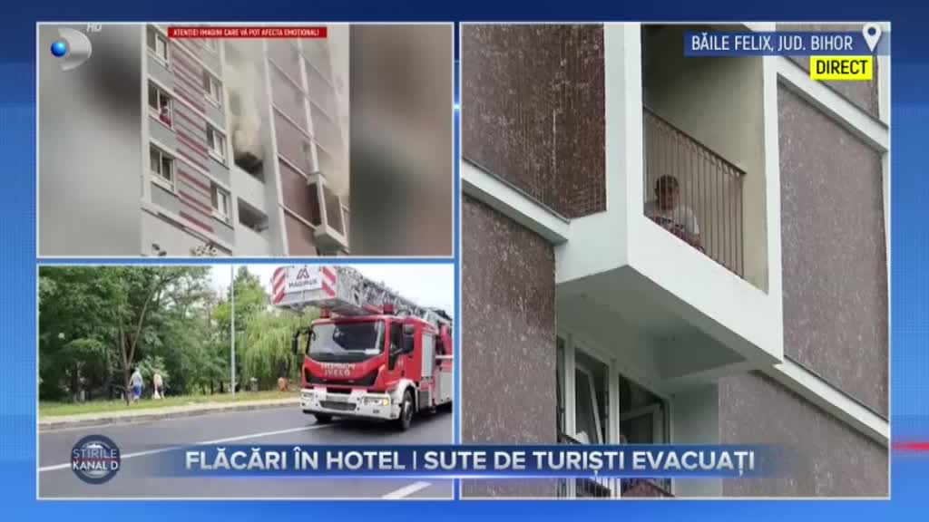Incendiu violent la Băile Felix. Flăcările au curprins două camere ale unui hotel din stațiune, iar turișii din clădire au fost evacuați. Unii dintre ei s-au autoevacuat pe scările de incendiu. Polițiștii au început o anchetă în acest caz.