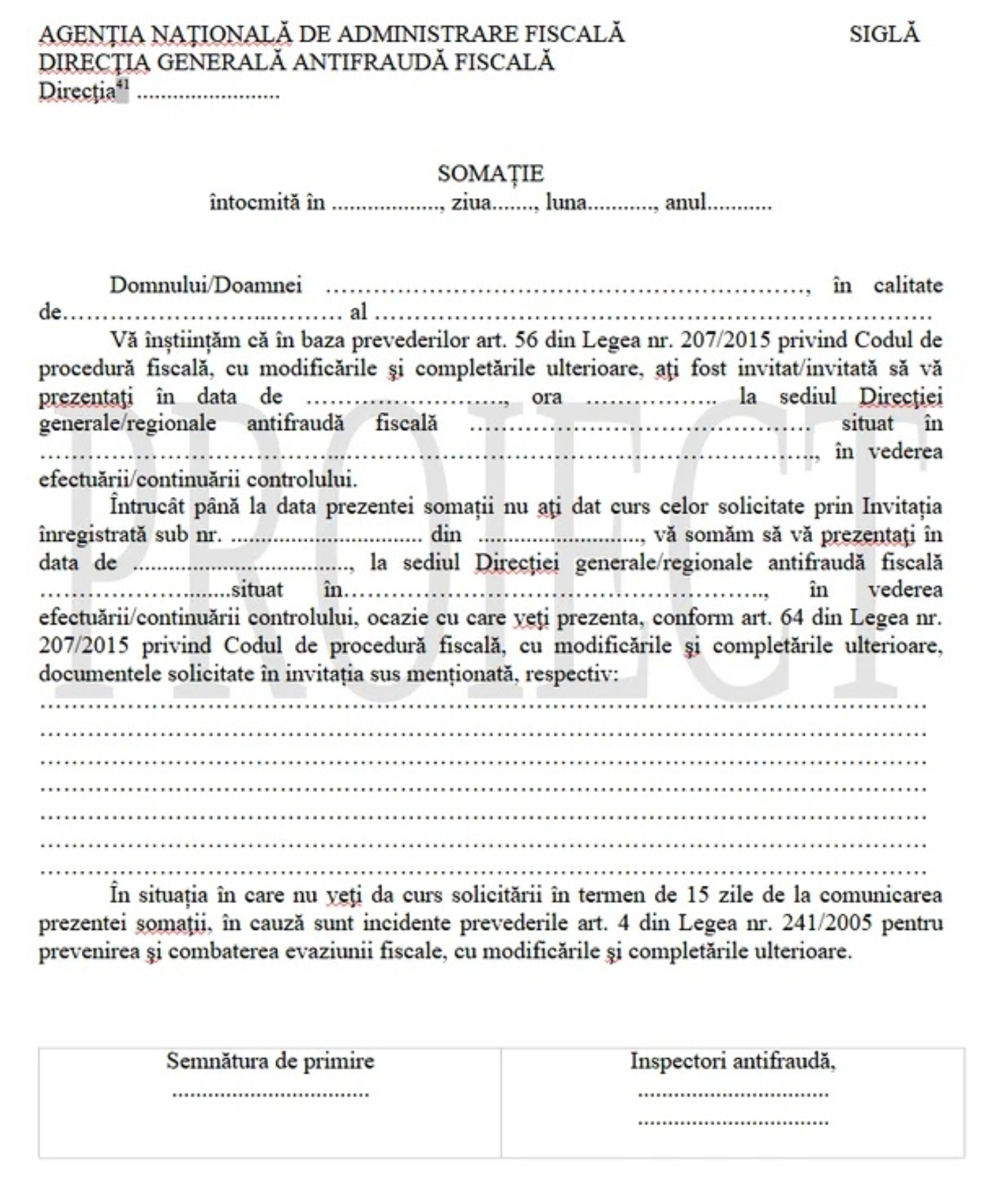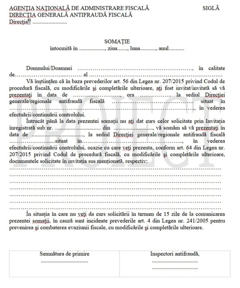 „Din practica controalelor a rezultat că, în nenumărate situații, contribuabilul nu dă curs solicitării inspectorilor antifraudă de a prezenta documente în vederea efectuării/continuării verificărilor, solicitare formulată prin intermediul formularului ”Invitație”, cu consecința elaborării de acte de sesizare a organelor de urmărire penală în temeiul art. 4 din Legea nr. 241/2005 pentru prevenirea şi combaterea evaziunii fiscale, cu modificările și completările ulterioare (Legea nr. 241/2005)”, se arată în referatul de aprobare al proiectului de ordin emis de ANAF.