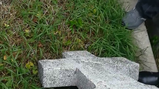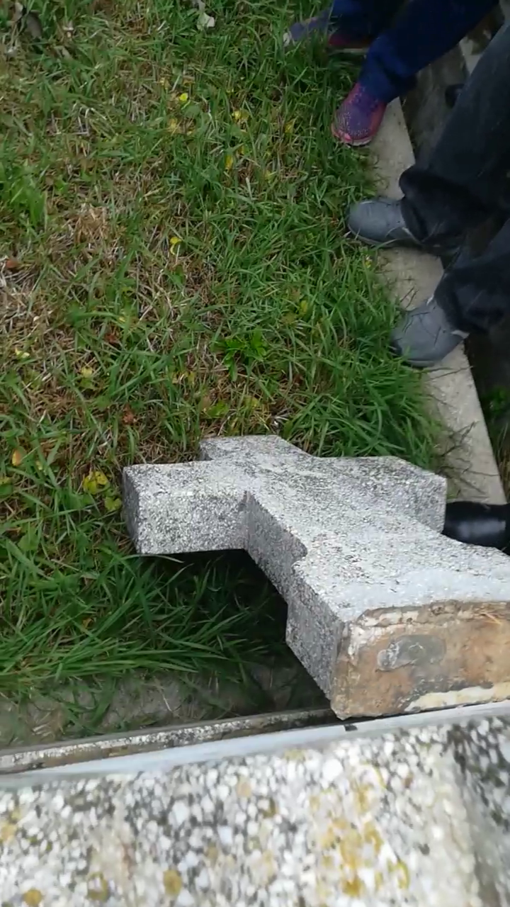 La o distanta de doar cateva minute, un alt barbat s-a sprijit pe o cruce din piatra pe care a daramat-o, culmea, chiar sub ochii unui jandarm care i-a spus ca-l amendeaza pentru profanare de morminte.