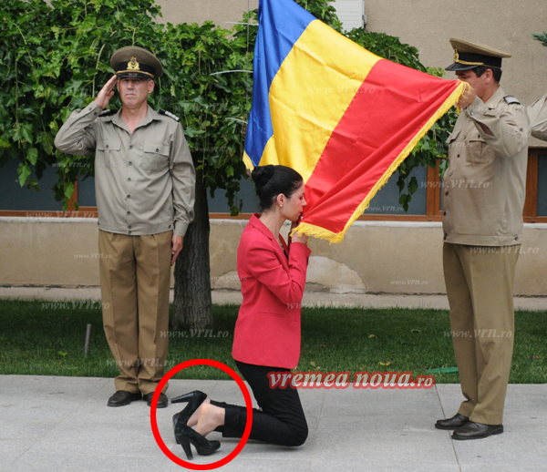 Ziua Drapelului a fost sarbatorita in toata tara, iar politicienii nu puteau sa lipseasca de la aceste ceremonii. La Vaslui s-a consemnat o scena ridicola, cu Ana Birchall in rol principal, deputat PSD, care va candida la toamna pe listele organizatiei judetene. Ea s-a asezat in genunchi atunci cand a trebuit sa sarute steagul, dar pozitia complicata i-a jucat o festa, un picior iesindu-i din pantoful cu toc.