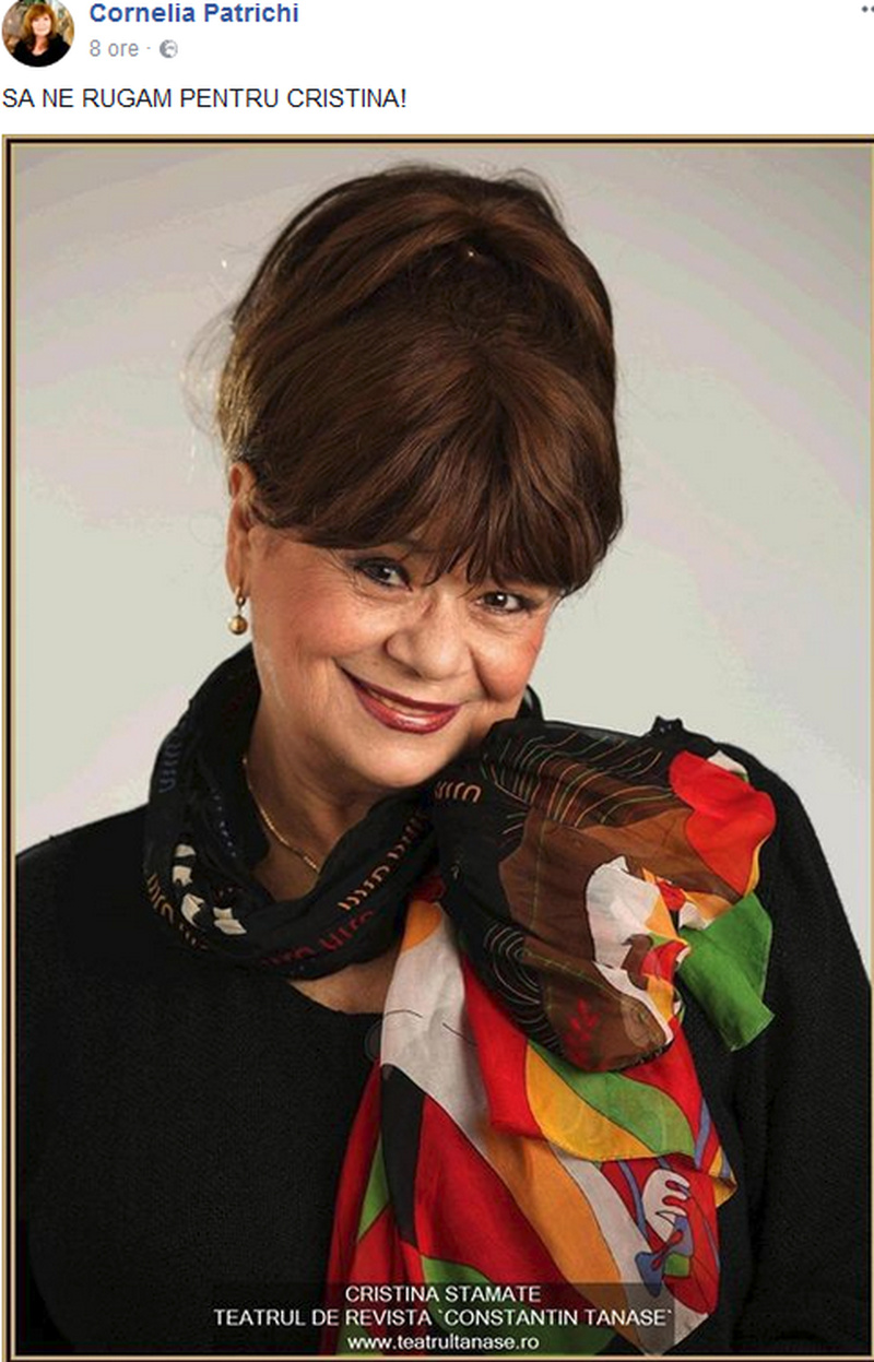 Mai multe vedete au postat pe adresele lor de socializare imagini cu vedeta teatrului romanesc, cu mesajul simplu “Sa ne rugam pentru Cristina”!!!