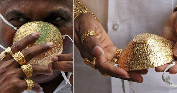 Când iese în oraş, acest bărbat în vârstă de 49 de ani poartă bijuterii de aur în greutate de peste un kilogram, precum un lanţ gros, o brăţară şi inele pe fiecare deget al mâinii. Shankar Kurhade, care este proprietarul unei companii care fabrică hangare, a explicat că a avut ideea acestei măşti după ce a văzut un reportaj cu un bărbat care purta un model din argint.