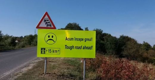 Pentru a mai infrana elanul soferilor care isi pierd rabdarea in coloana, angajatii de la drumuri au montat experimental cateva indicatoare care sa-i previna ca urmeaza un sector obositor de sosea. Pe panouri sunt texte ca ”Acum incepe greul” si ”Rezista”, insotite de emoticon cu fete zambitoare sau triste.