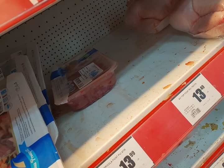 O clienta a supermarketului din Comanesti, Bacau a mers luni seara la cumparaturi si a fost socata de ce a vazut la raionul de carne. Tanara a publicat pe retelele de socializare imaginile de groaza, scandalizata de modul in care li se vinde oamenilor mancare. Pachetele cu carne sunt aruncate pe niste rafturi murdare, pline de resturi si sange.