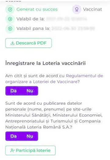 - Selectare optiune “PARTICIPA LA LOTERIA DE VACCINARE”
